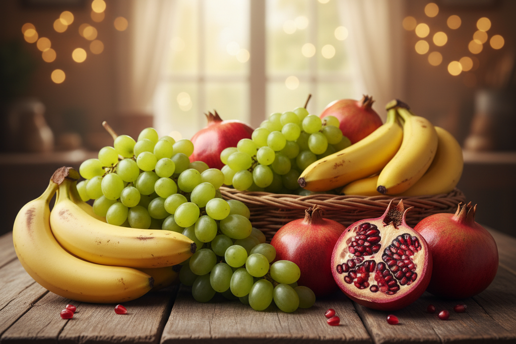 Farm-fresh fruits — Banana, Mango, Pomegranate, Grapes, Watermelon, Muskmelon, Coconut — delivering natural sweetness, flavor, and quality globally.